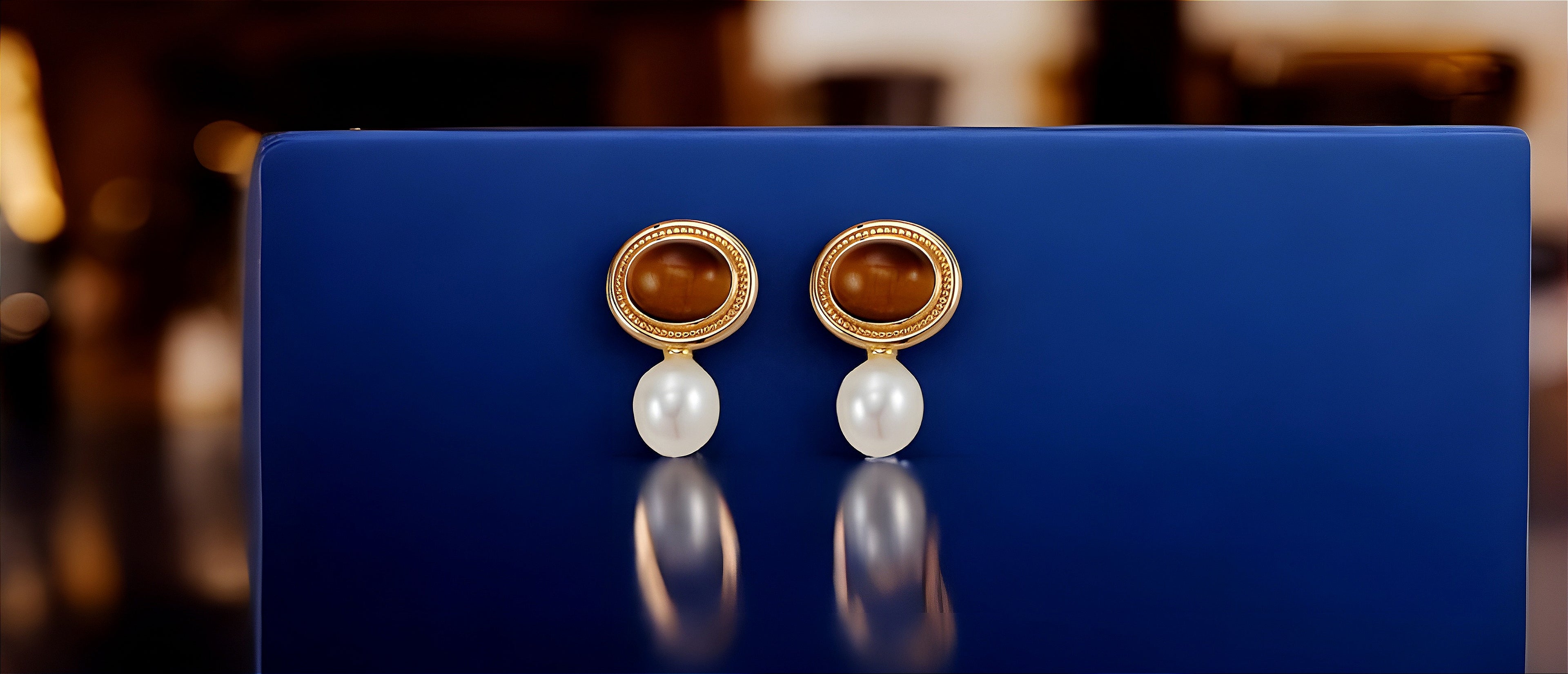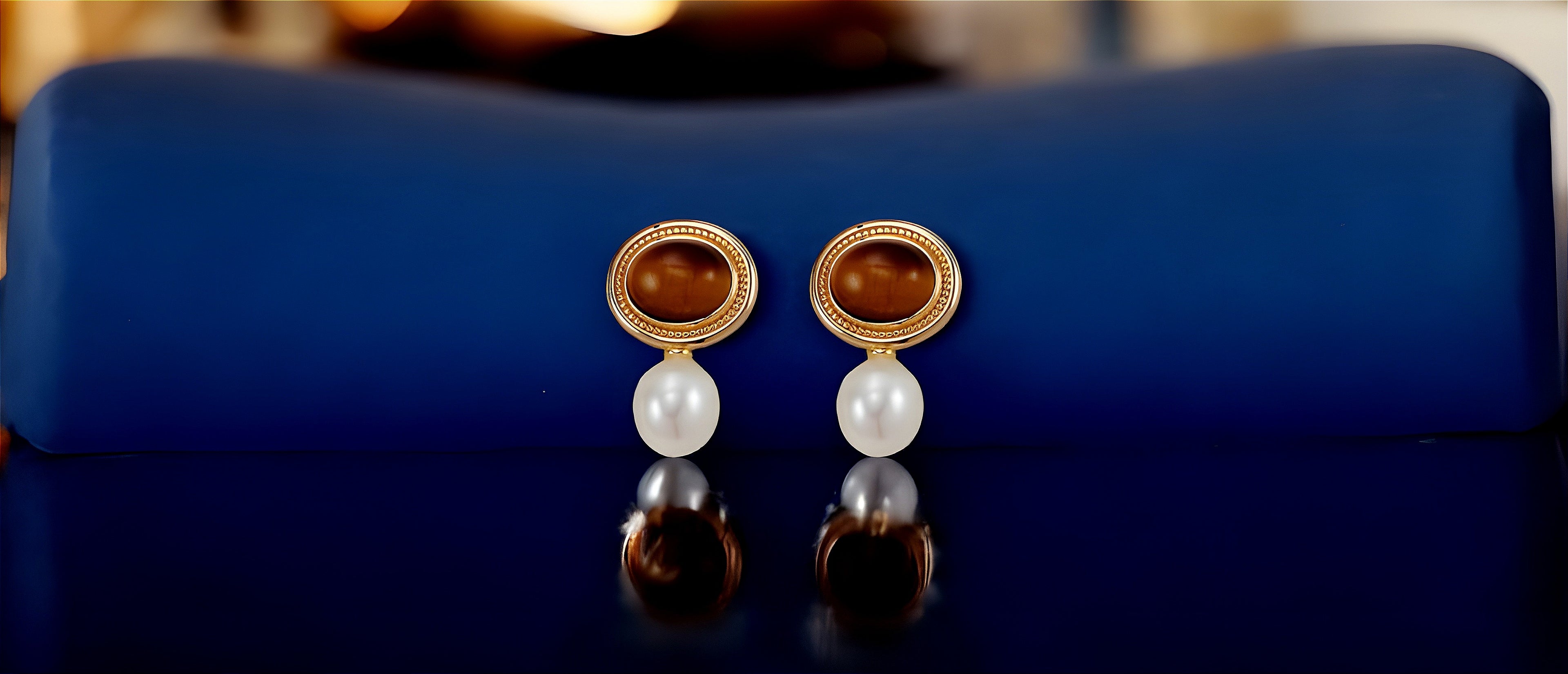 A timeless fusion of warmth and elegance, these drop earrings feature the golden sheen of Tiger's Eye and the luster of freshwater pearls. The Tiger's Eye, known for its grounding energy, is set within a delicate beaded frame, cascading into a radiant pearl that softly reflects light.