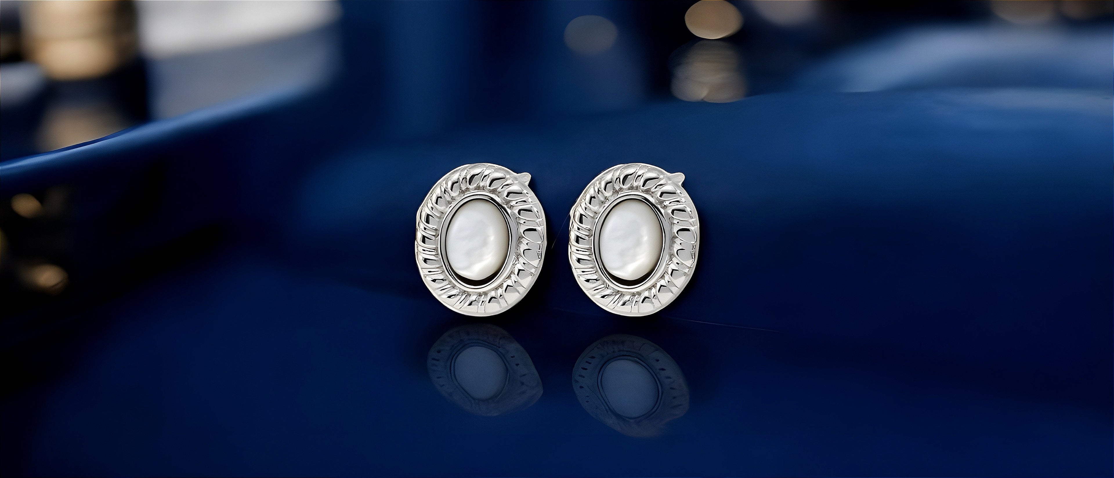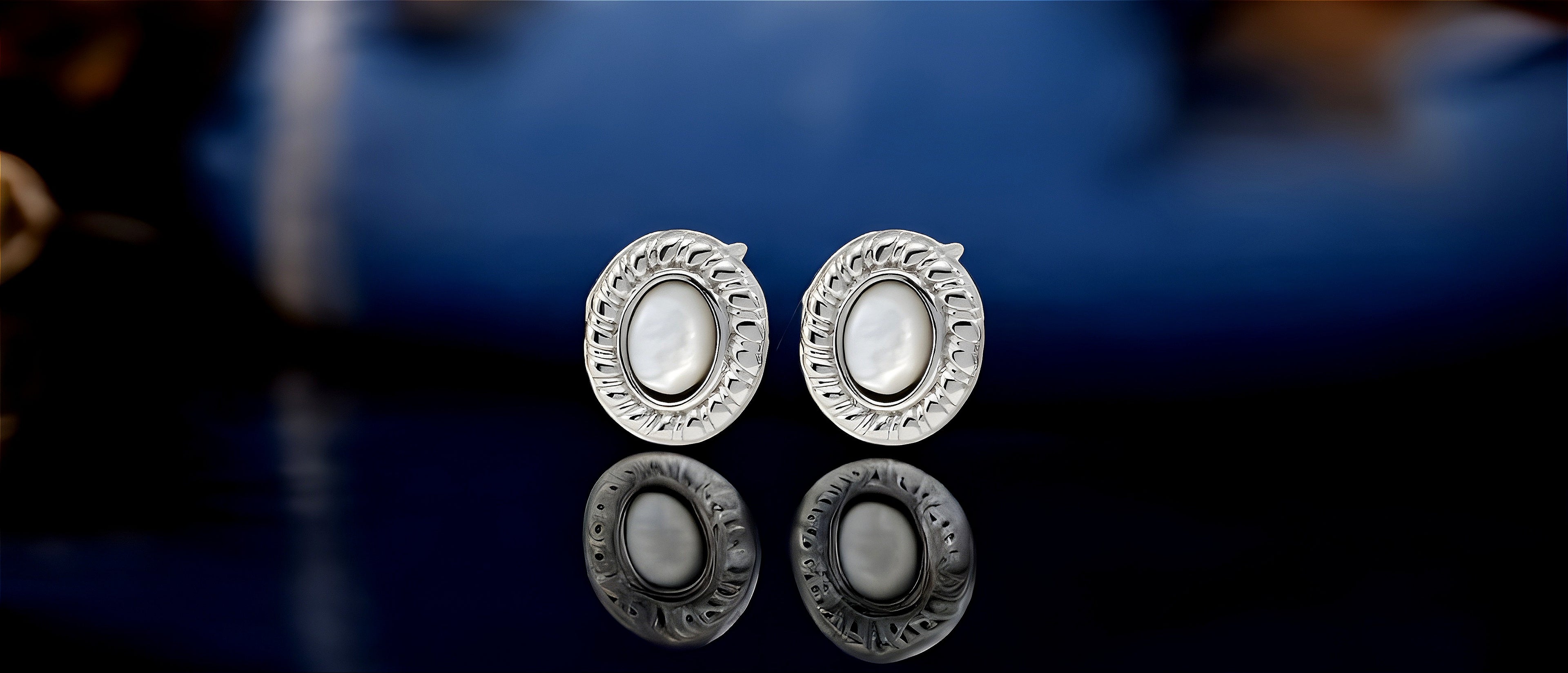 Echoing the timeless charm of vintage elegance, these sterling silver earrings feature radiant oval Mother-of-Pearl centers, framed by intricately textured bezels. The luminous sheen of the pearl harmonizes with the refined craftsmanship, creating an understated yet luxurious accessory. Perfect for sophisticated gatherings or everyday elegance, these earrings encapsulate a classic yet modern aesthetic.
