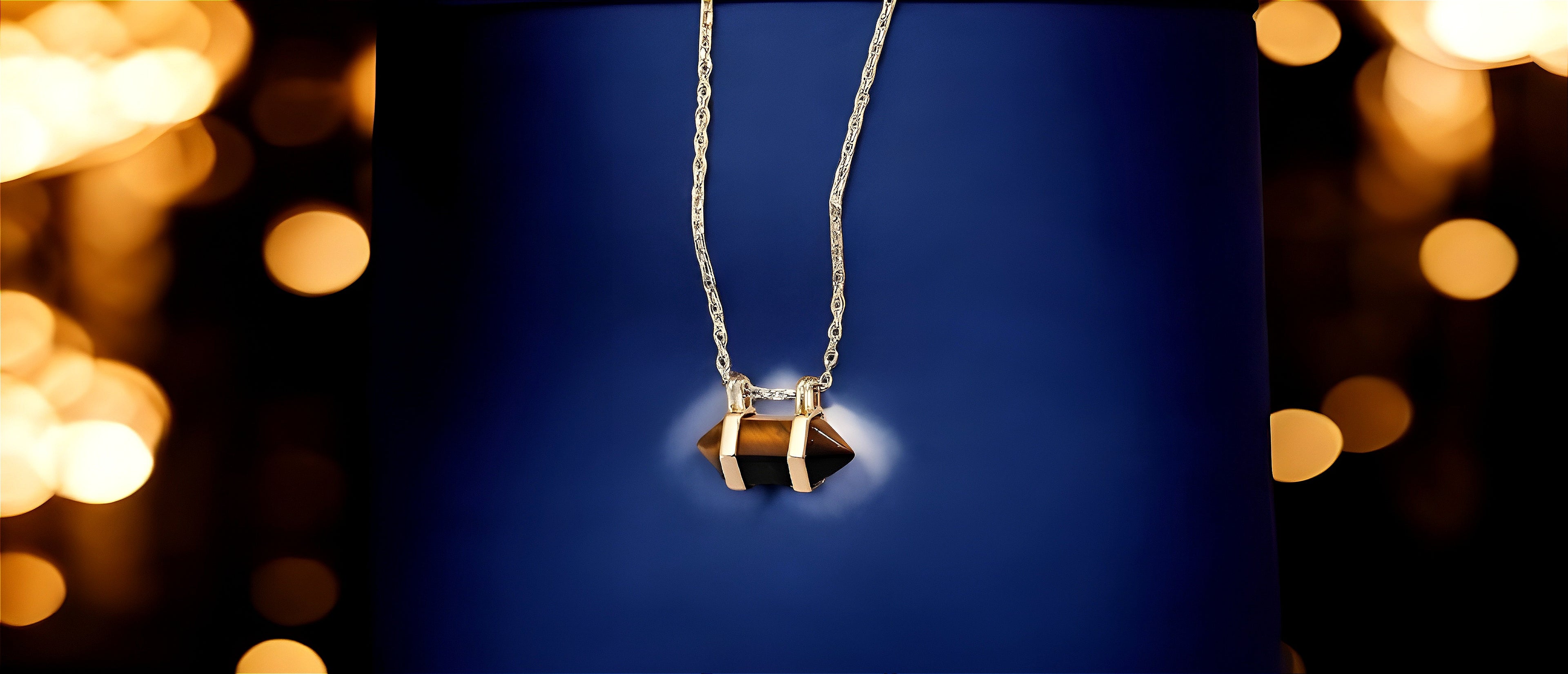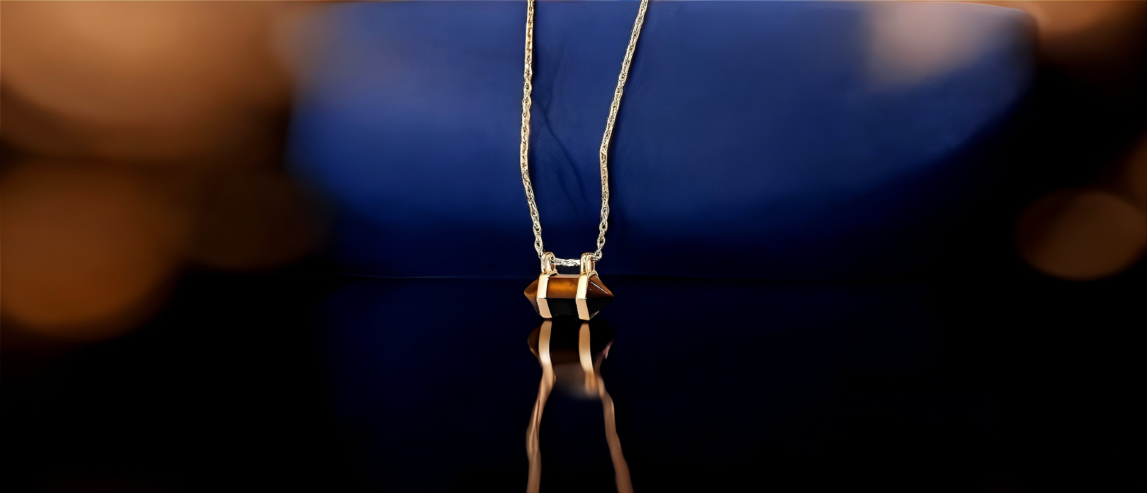 A sculptural masterpiece blending classic luxury with modern charm, this necklace is adorned with a striking Tiger's Eye gemstone cradled in a sleek gold-plated sterling silver frame. It's pendant evokes strength and grounded elegance, while the elongated shape creates a bold yet refined statement, perfect for every occasion.