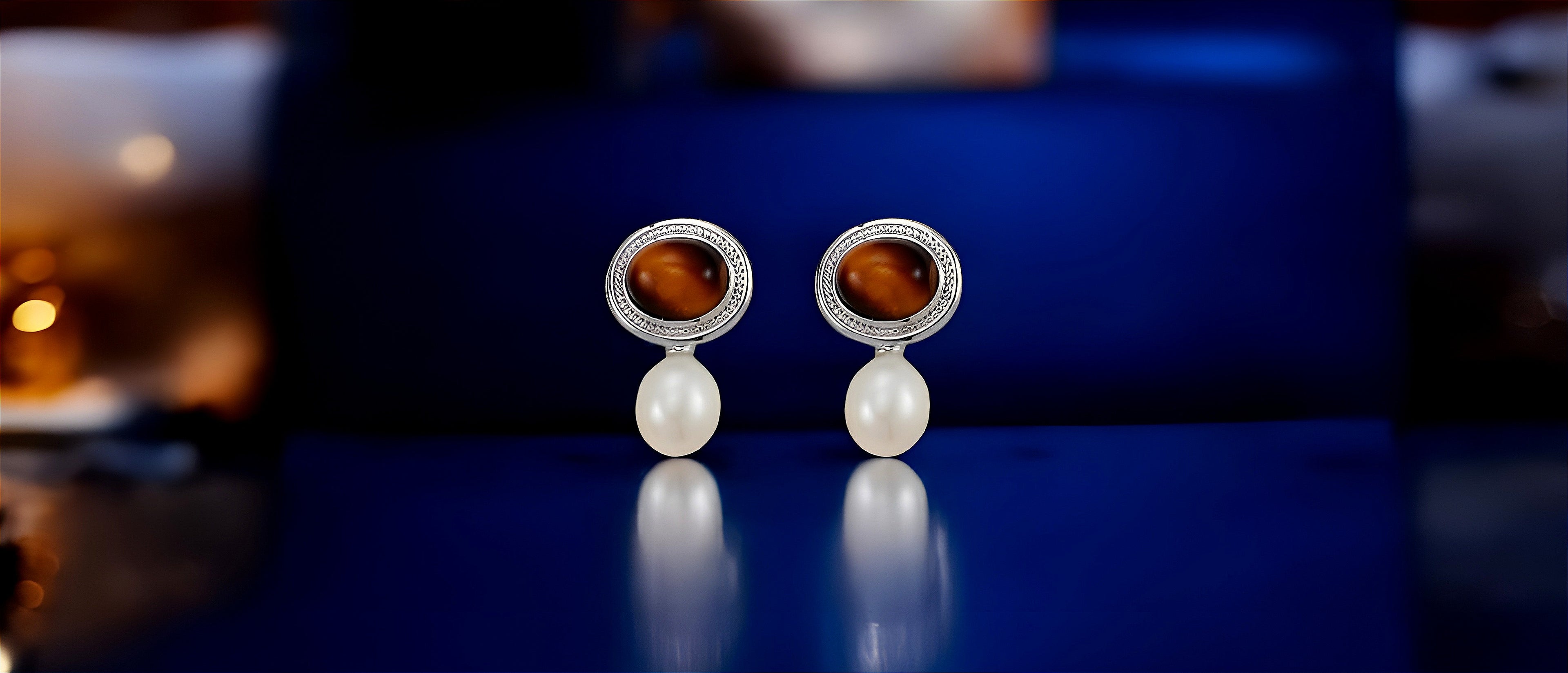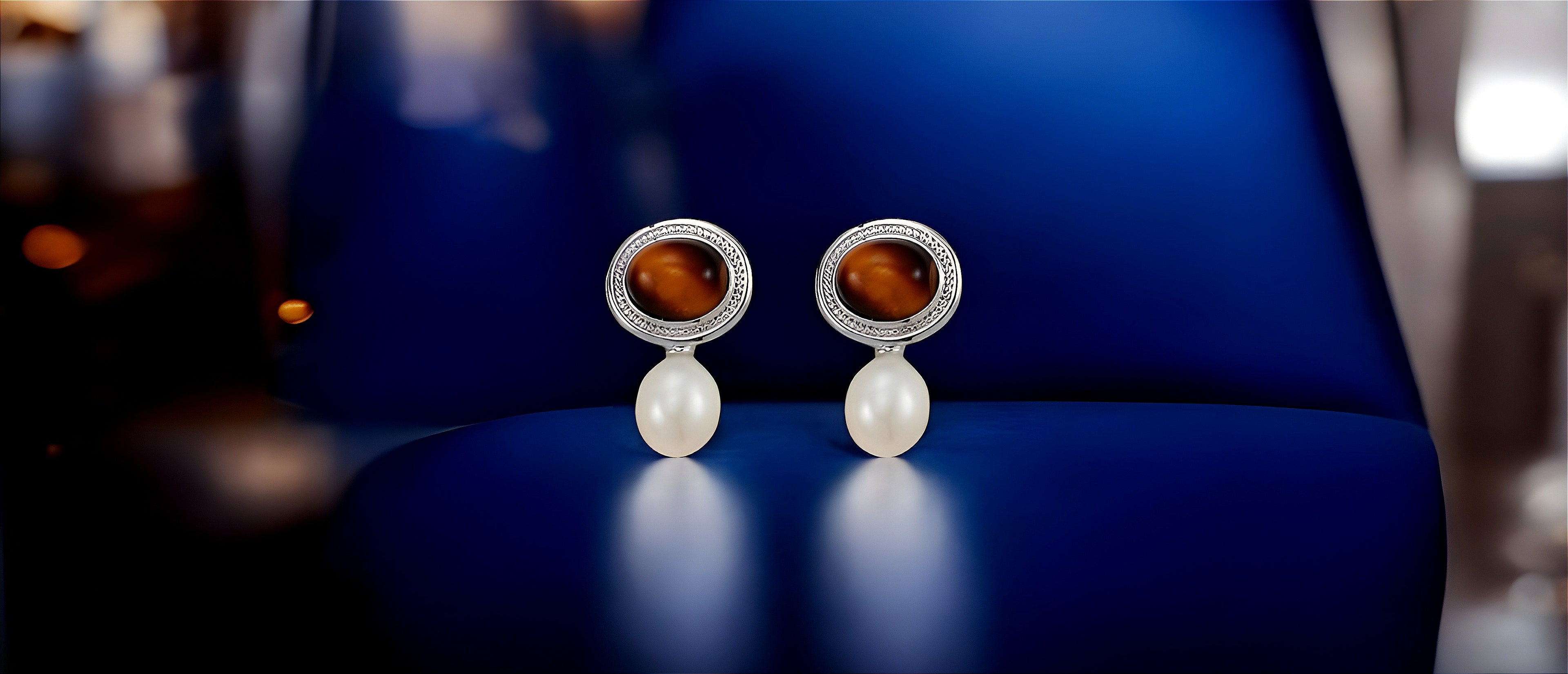 A harmonious blend of nature's elegance, these earrings feature the captivating chatoyancy of Tiger's Eye stones contrasted with the soft luster of freshwater pearls. Their drop design evokes grace and sophistication, making them the perfect companion for both formal and contemporary settings. The detailed metalwork frames the stones in timeless charm, creating a refined, vintage appeal.